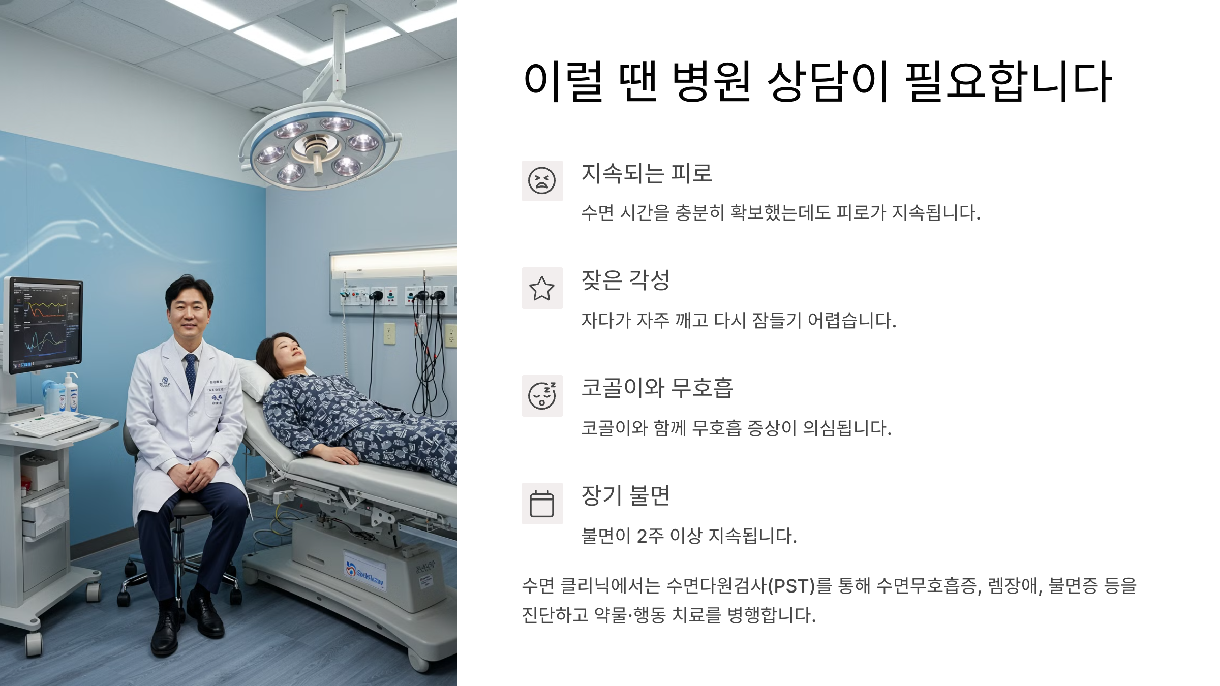 📌 수면 클리닉에서는 수면다원검사(PST)를 통해 수면무호흡증, 렘장애, 불면증 등을 진단하고 약물·행동 치료를 병행합니다.