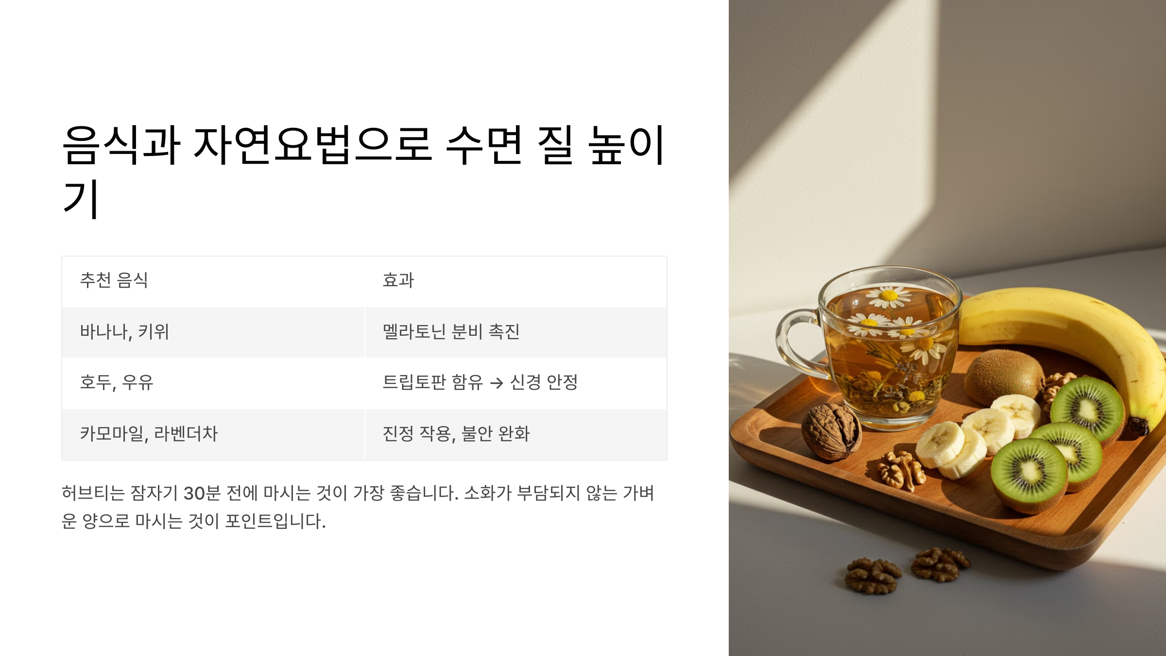 호두, 우유 | 트립토판 함유 → 신경 안정 |