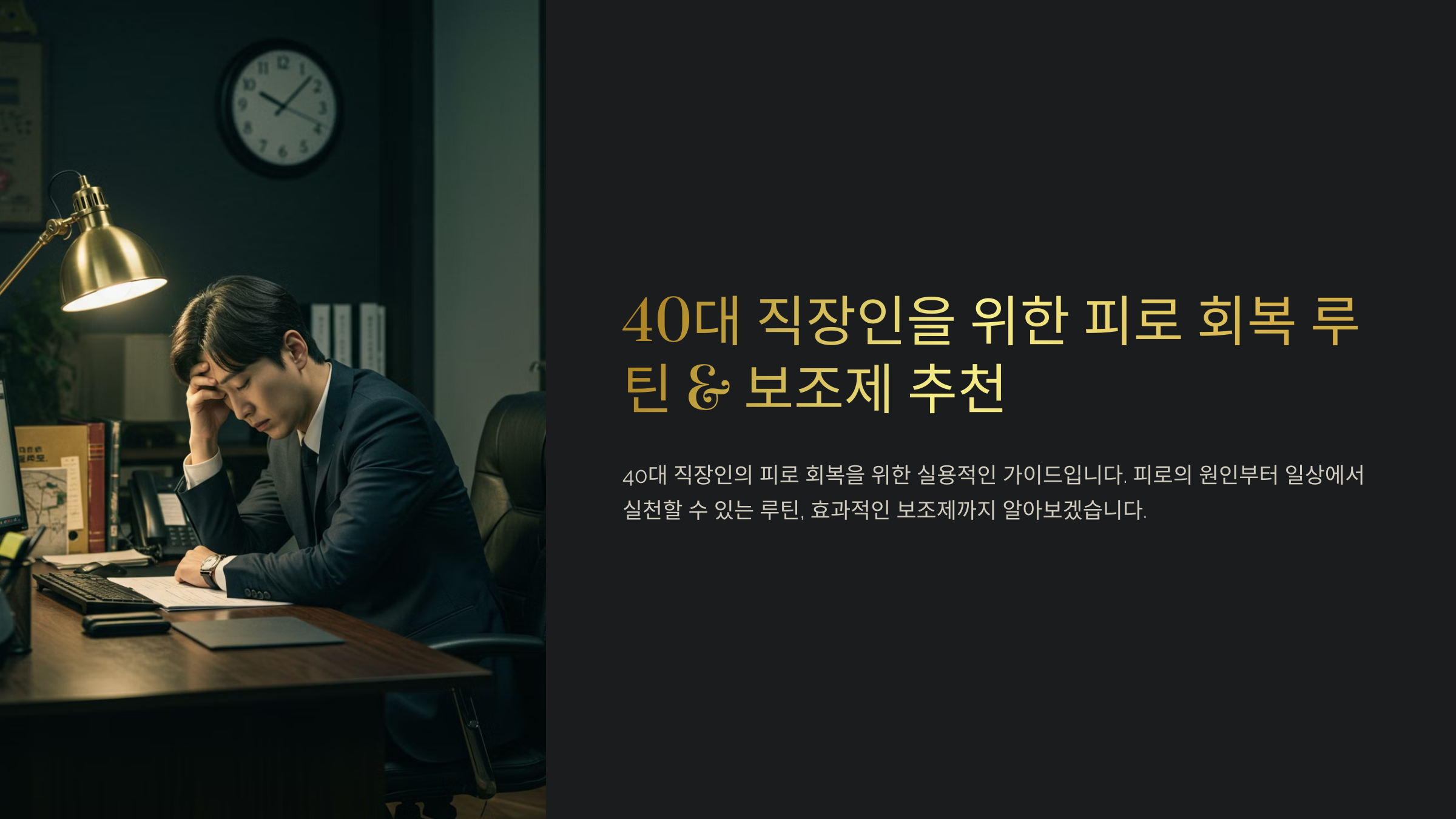 40대 직장인을 위한 피로 회복 루틴 & 보조제 추천📌 목차1. 40대가 피로를 더 자주 느끼는 이유2. 피로를 관리하는 3가지 루틴3. 피로 회복을 돕는 보조제 추천4. 생활 속에서 바로 할 수 있는 팁5. 마무리 – 피로는 쌓이는 게 아니라 무너지는 것1. 40대가 피로를 더 자주 느끼는 이유하루 종일 일하고 퇴근하면 똑같이 저녁 먹고 쉬었는데, 30대 때랑 다르게 몸이 계속 무겁고 피로가 안 풀리는 느낌, 많이 느끼죠?40대는 기초 대사량이 줄고, 호르몬 변화, 수면 질 저하가 한꺼번에 겹치는 시기입니다. 특히 **직장인의 반복되는 야근, 앉은 자세, 정신 피로**는 에너지 고갈의 주범이에요.이럴 때 필요한 건 '하루 이틀 푹 쉬기'가 아니라, 지속 가능한 회복 루틴입니다.2. 피로를 관리하는 3..