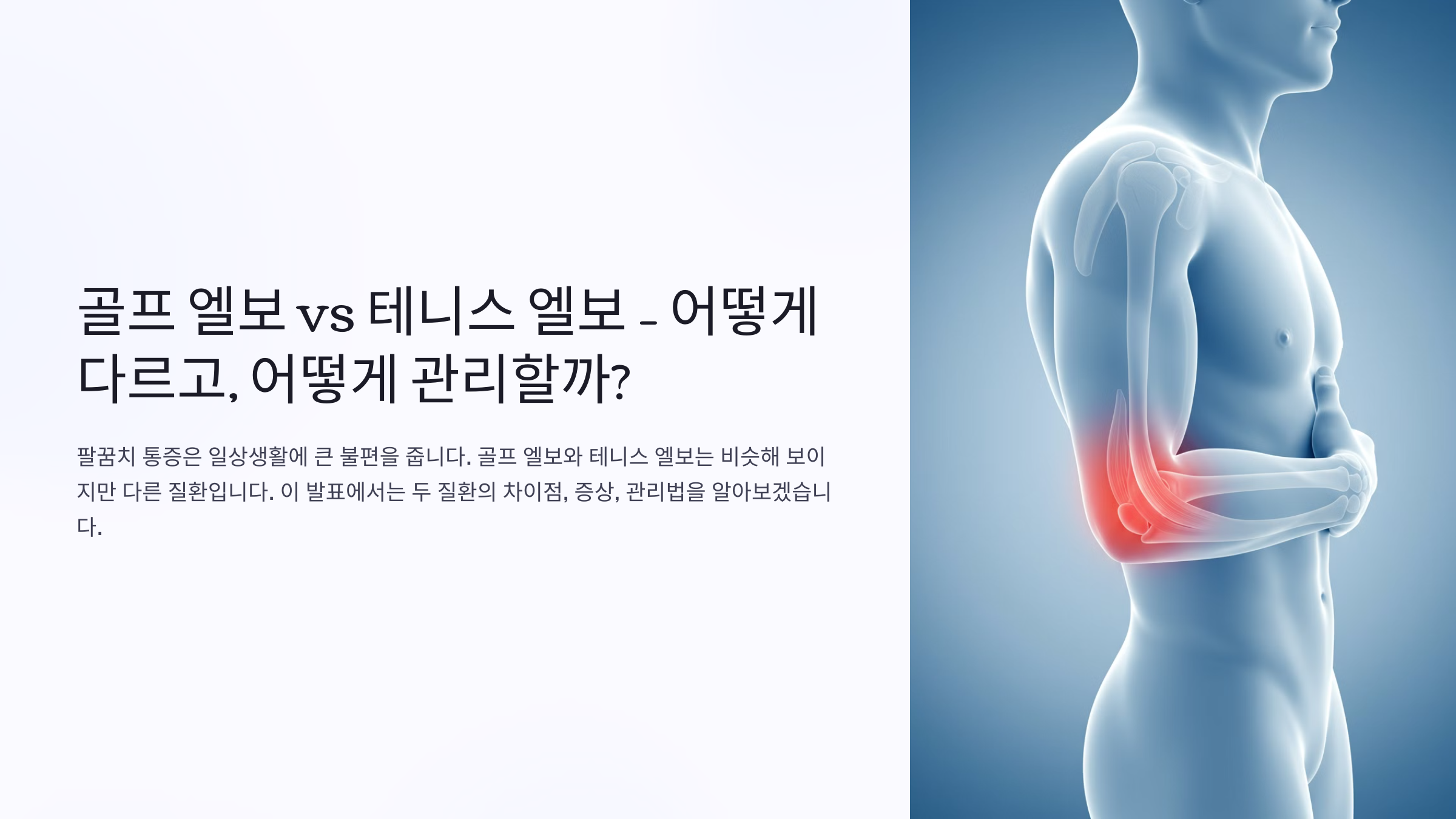 골프 엘보 vs 테니스 엘보 – 어떻게 다르고, 어떻게 관리할까?📌 목차1. 골프 엘보와 테니스 엘보, 어떻게 다른가요?2. 주요 증상 및 셀프 진단법3. 왜 생길까? 발생 원인과 고위험 행동4. 회복을 위한 실전 관리법5. 도움이 되는 스트레칭과 강화 운동6. 병원 진료가 필요한 경우7. 예방을 위한 일상 습관 루틴8. 마무리 – 팔꿈치는 ‘버텨주는 관절’입니다1. 골프 엘보와 테니스 엘보, 어떻게 다른가요?둘 다 팔꿈치 통증을 유발하는 대표적인 질환이지만, 통증이 발생하는 부위와 사용하는 근육군이 다릅니다.구분골프 엘보 (내측 상과염)테니스 엘보 (외측 상과염)통증 위치팔꿈치 안쪽 (내측)팔꿈치 바깥쪽 (외측)관련 동작물건 쥐기, 주먹 쥐고 당기기손목 젖히기, 타이핑, 젓가락질발생 원인당기는 힘 반..